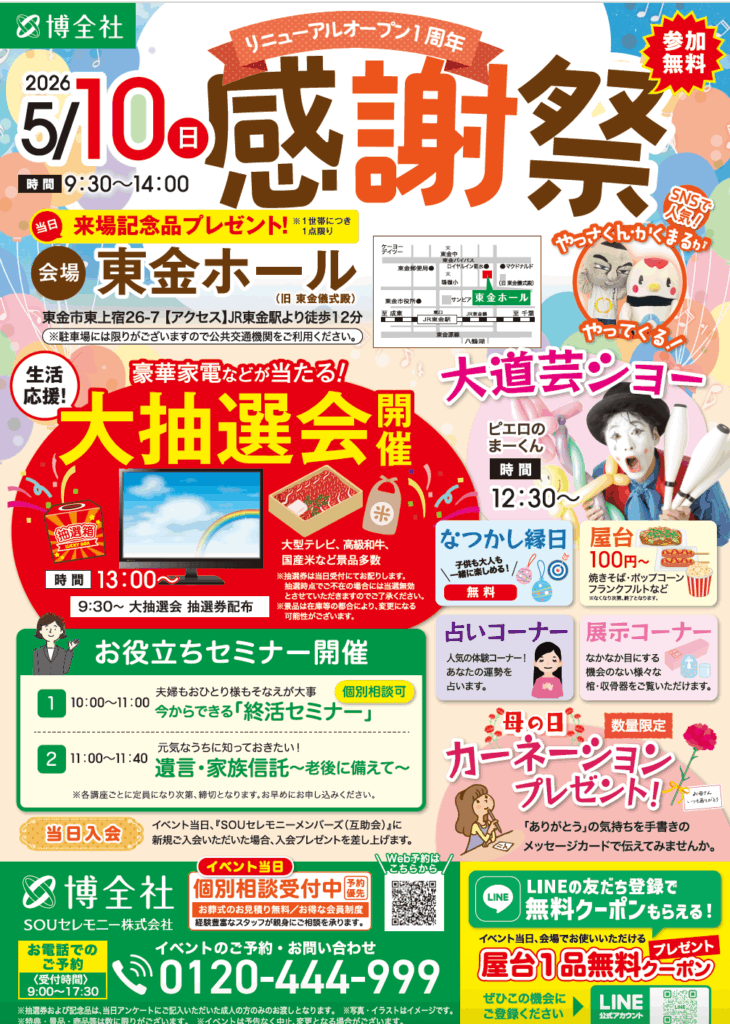 お陰様でリニューアルオープン1周年。お役立ち終活&遺言・家族信託セミナー/大抽選会/大道芸/なつかし縁日/占い/屋台/(数量限定)母の日にぴったりなカーネーションプレゼント!