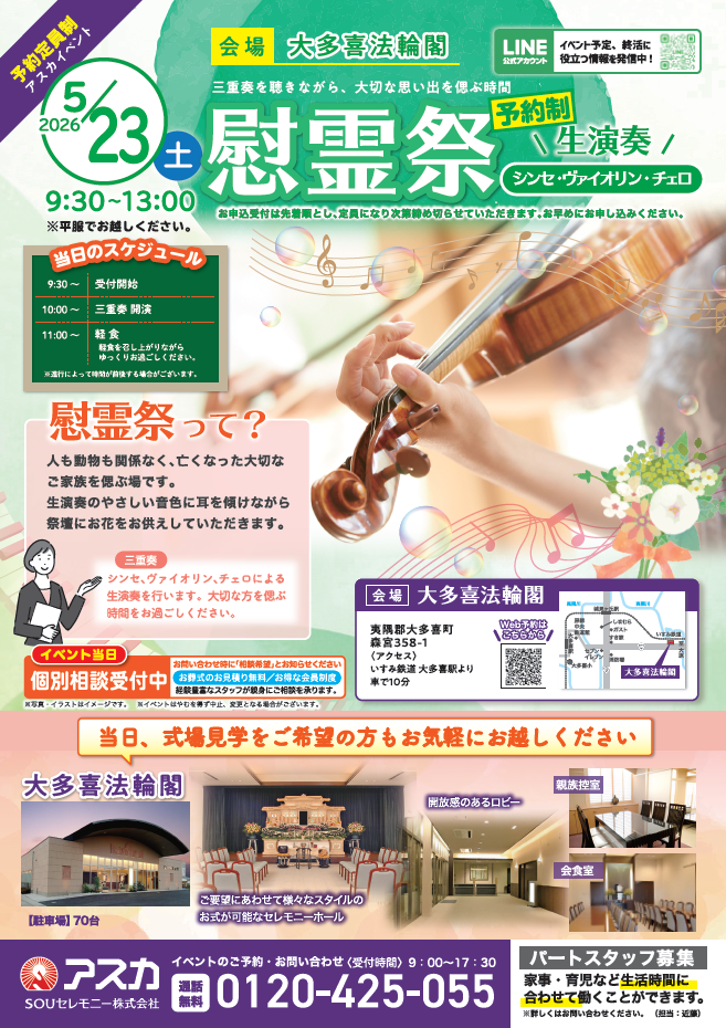 《ご予約ください》シンセ・ヴァイオリン・チェロの三重奏を聴きながら大切な思い出をしのぶ、慰霊祭を開催します(軽食付き)