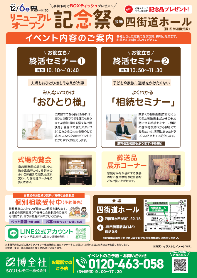 ※ご予約の際、参加希望のセミナーをお申し出ください。また、メモリアル写真撮影、個別相談をご希望の方はお電話にてご予約時間をお伝えいたします。