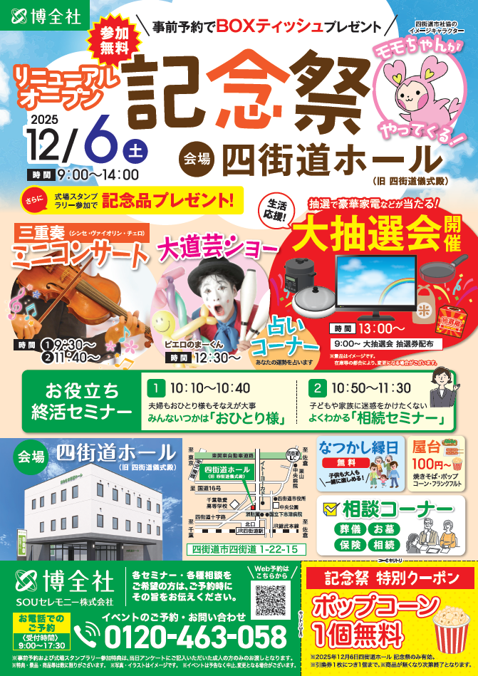 四街道儀式殿が「博全社 四街道ホール」としてリニューアルオープン。12月6日(土)にはリニューアルオープン記念イベントを開催します!!