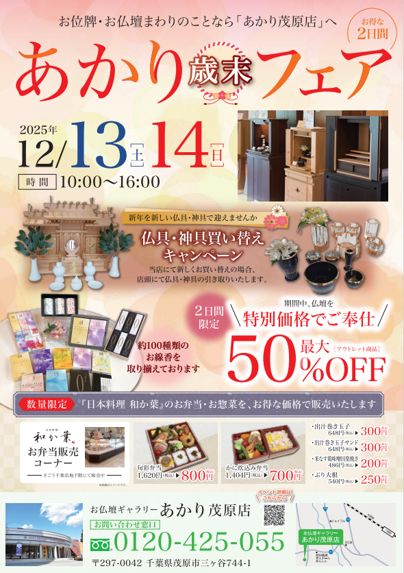 12/13(土)・14(日)、お仏壇ギャラリーあかりにて、毎年恒例の「歳末フェア」を開催いたします。