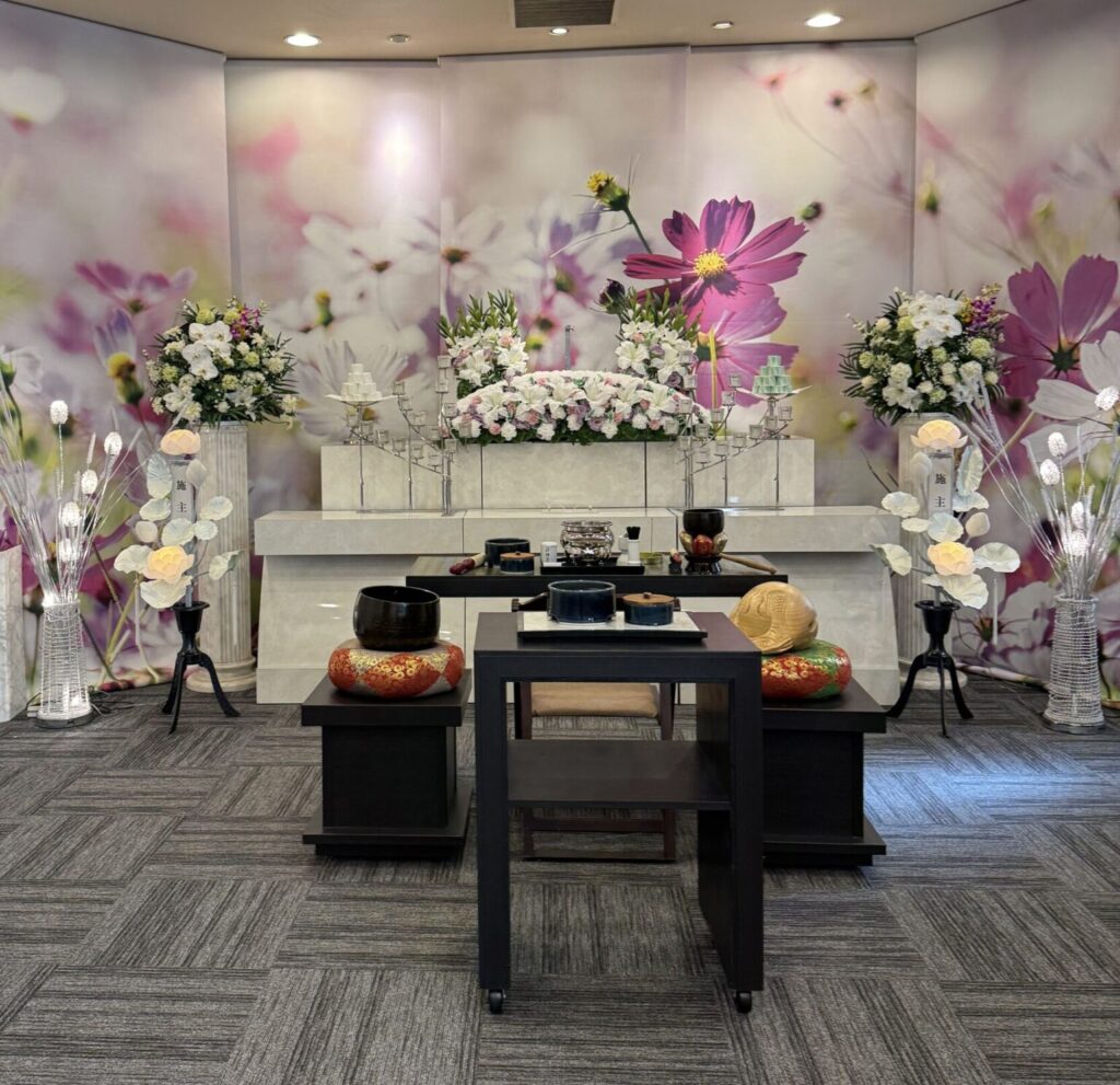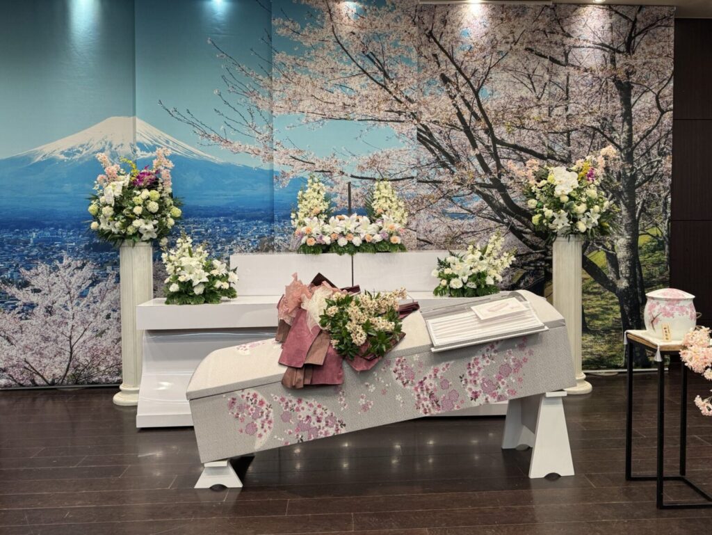祭壇をはじめ、お棺や収骨器など春を感じられるような様々な葬送品も展示。お別れのシーンではありますがその明るい雰囲気に、たくさんの方が関心をお寄せになっていらっしゃいました。